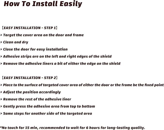 - 【Easy Installation - Step 1】Target the cover area on the door and frame > Clean and dry > Close the door for easy installation > Adhesive strips are on the left and right edges of the shield > Remove the adhesive liners a bit of either the edge on the shield.