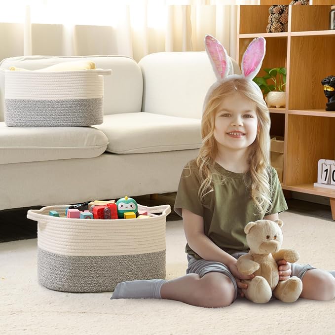 - 【Applicable】The woven basket can store children's products, such as children's toys、baby diapers、baby clothes、baby laundry basket,snacks、books、 blankets、towels、and other baby products.It is the perfect storage basket for living rooms、bedrooms、bathrooms、baby rooms、miscellaneous rooms、 playrooms、daycare centers、classrooms、offices、warehouses、and storage rooms.The rope basket can also be used as a basket for home storage, organizing clothes and shelves, making your room cleaner and tidier.