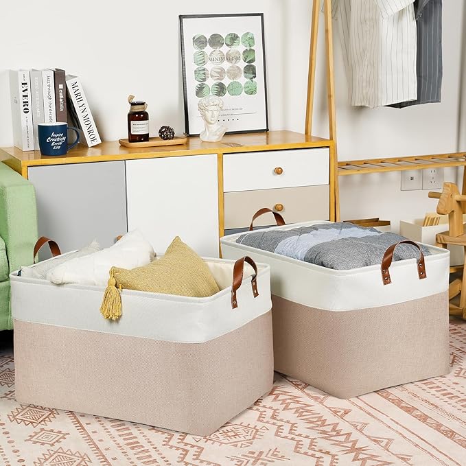 DULLEMELO Extra Large Baskets for Organizing, 22" X 15" X 13" Rectangle Fabric Storage Bins, Foldable Blanket Basket Living Room, Large Kids Toy Storage Organizer Bins, Baby Basket Gift (White&Khaki)