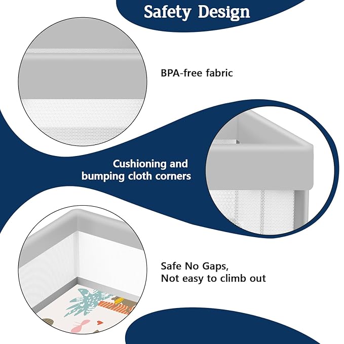 - 【360 ° VISUAL DESIGN】The Baby playpen is 360 ° Full View, even if you are busy doing other things, its sides allow you to keep an eye on baby at all times. At the same time, baby can also see mom through the mesh, making them feel full safety.