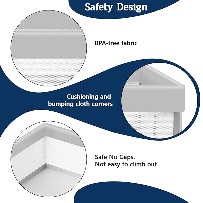- Multiple Protection Design- Our baby playard has a good height on the sides,about 27inch, Baby can't try to climb over the edges of it.Playard with Anti-Slip base,safe&stable.Plus,it links are covered with a thick fence fabric to cushion the damage caused by baby bumps.