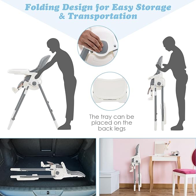 - Easy Use Clean Fold: The highchairs requires no installation. Removable BPA-free plastic trays that are dishwasher safe. Also has a removable waterproof PU leather cushion that can be wiped off with a clean cloth. What's more, the foldable high chairs not only folds up effortlessly in 5 seconds when not in use, but also stands up freely after folding. Compact folding size suitable for storage in any corner.