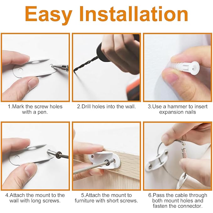 - 【EASY TO INSTALL & QUICKLY RELEASE】: By using anti-tip furniture anchors, tall furniture can be easily secured within minutes. With the screw closure design, this metal wire can also be quickly released, allowing for easy furniture movement and cleaning behind it.