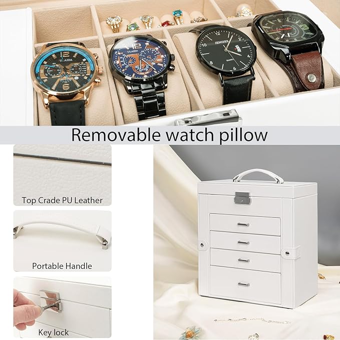 - 【5 LAYERS with 4 Versatile Pull Out Drawers & 2 Hidden Side Cabinets】 Multi-layer design to meet different storage needs,Top layer have 4 watch pillows.Drawer 1 includes a big ring roll and 4 ear stud cards.Drawer 2 includes 12 square compartments.Drawer 3 includes 4 compartments, suitable to store bracelets, chains, etc.Drawer 4 only has one compartment, deeper enough to store sunglasses or other big jewelries