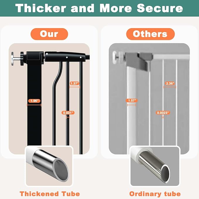 - 【1.37" Narrow Space】Metal adjustable baby gate indoor ultra-narrow gaps between each two bars are only 1.37", which effectively prevents pets and kids bodies or heads from getting stuck. Extra tall pet gate has an upgraded thicker pipe wall, making it more solid and stable.