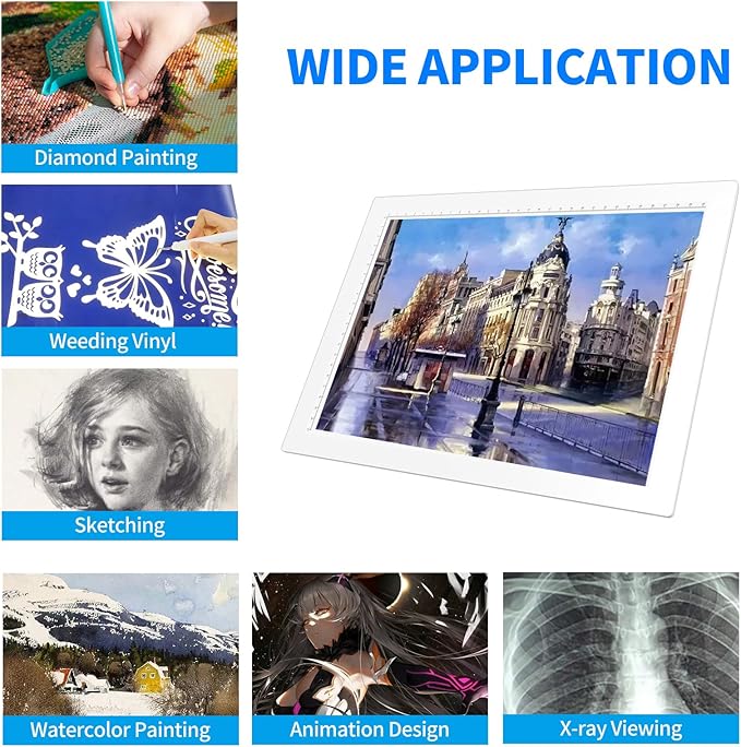 - 【 Wide Application 】 Overall dimension including frame is 13.4" * 9.8". The visual working area is 12.2" * 8.6". The A4 tracing drawing board is large enough for diamond painting. It's also ideal for stenciling, animation, calligraphy, embrossing, tattoo transferring, sketching & drawing, streaming, sewing projects, stained glass, quilting etc. Best gifts for Christmas, Birthday or other holidays. If you are not satisfied with your purchase, please contact us, we will reply you within 24 hours.