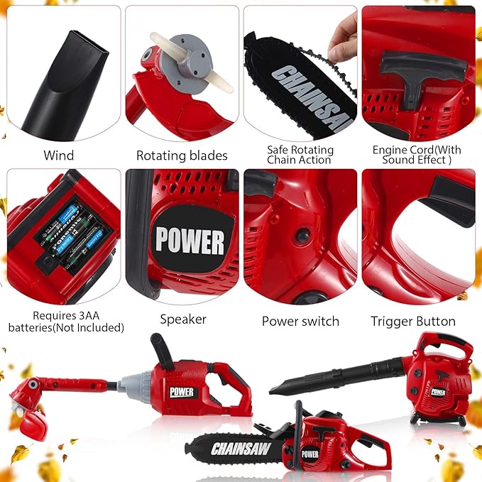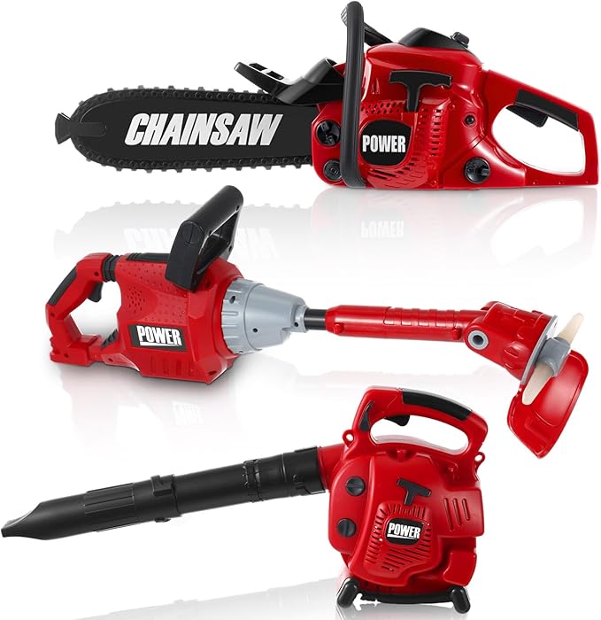 - Complete Play Tool Set for Kids: our kids lawn equipment toys set is a nice bundle to keep your child entertained and engaged; The set includes a fake leaf blower, a fake lawn trimmer line, and a fake chainsaw, all designed to match real world models; In bold red and black colors