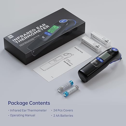 - Included Components : 1×Ear Thermometer, 2×AA Batteries, 24×Probe Covers, 1× Storage Bag, 1×Manual