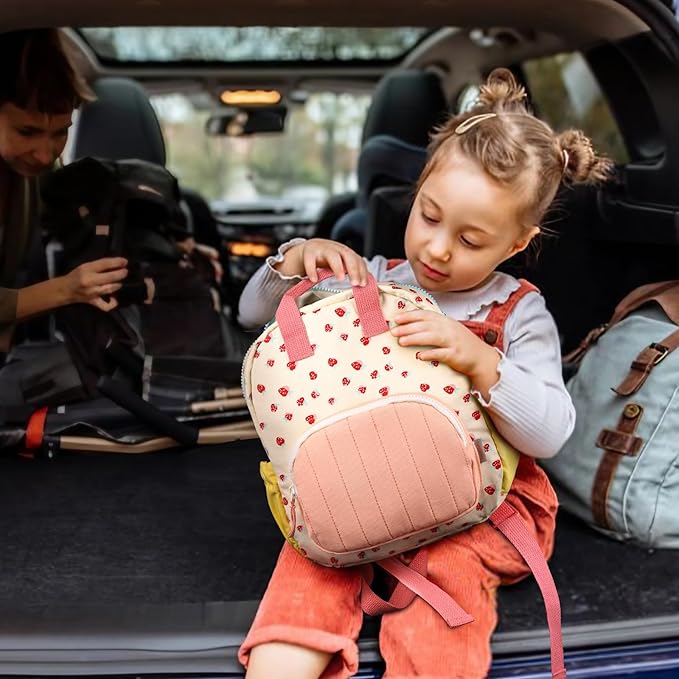 - 🍓【Attractive mini kids backpack】:GAGAKU kids backpack is made of high quality cotton-polyester blend, Made of high quality and harmless materials, it is comfortable and lightweight, so that children can carry it with more peace of mind,personalised backpack for girl boy with pink strawberry print, easy to clean, 11x9x3.5inch, 0.72pounds, perfect for girl aged 2 to 5 years old.