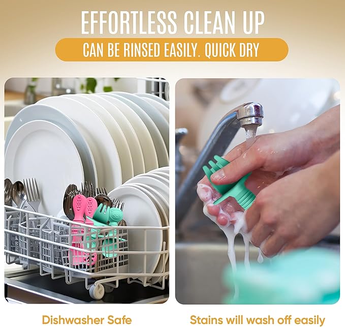 - EFFORTLESS CLEAN-UP: Made of high-quality food-grade silicone material, our baby silicone feeding set is very easy to clean up and will leave no stains. Simply, place the set in the dishwasher and they will come out clean and sanitized. These toddler spoons and forks are also lightweight and easy to hold, making it perfect for on-the-go meals.