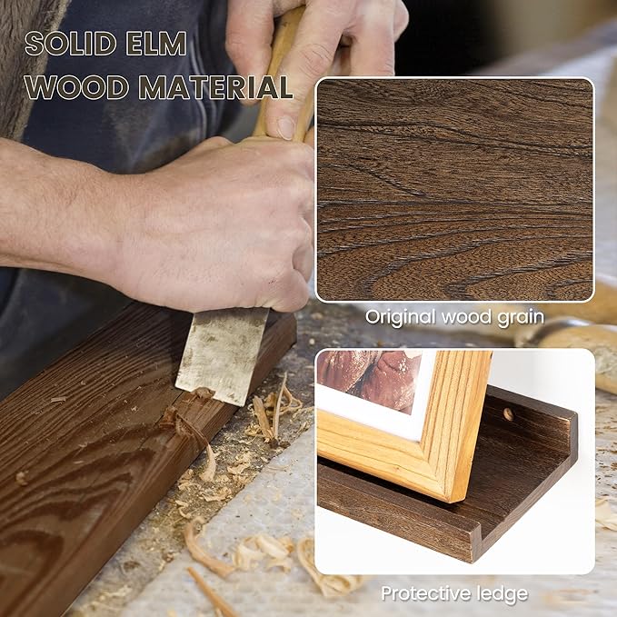 - 【100% Solid Elm Wood Shelves】Employing reclaimed elm wood renowned for its glamorous texture, we meticulously select pieces showcasing beautiful wood knots and distinctive grain patterns, enriching the character of your living space. Our hand-crafted wood shelf feature a rustic natural finish, ensuring durability for lasting appeal. Each shelf is distinct in grain, color, finish, and texture, adding a touch of uniqueness to your decor.
