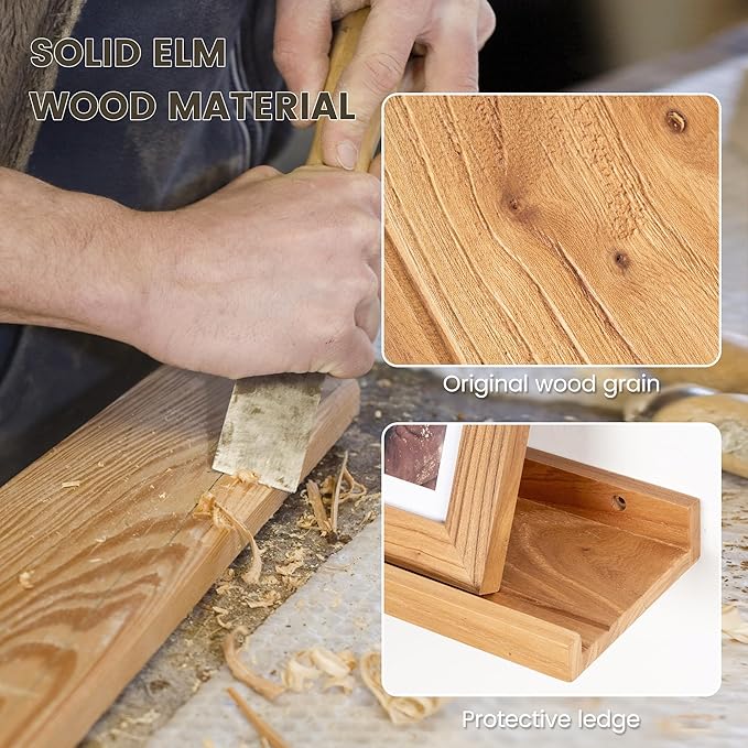 - 【100% Solid Elm Wood Shelves】Made from reclaimed elm wood, known for its beautiful texture, we carefully choose pieces with unique wood knots and grain patterns. Our hand-crafted wood shelf feature a rustic natural finish, ensuring durability for lasting appeal. Each shelf is diffrent in grain, color, finish, and texture, adding a touch of uniqueness to your decor.