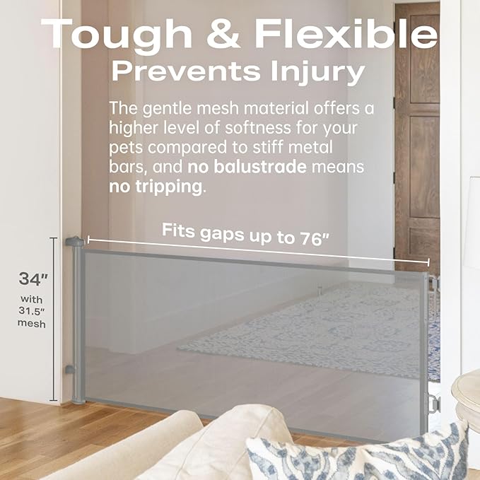 - Expandable Size: Our retractable gate extends up to 76" Extra wide and is 34" tall.The Cumbor mesh dog gate conveniently rolls up when not in use, making it easy to convert the room into an adult-friendly space again