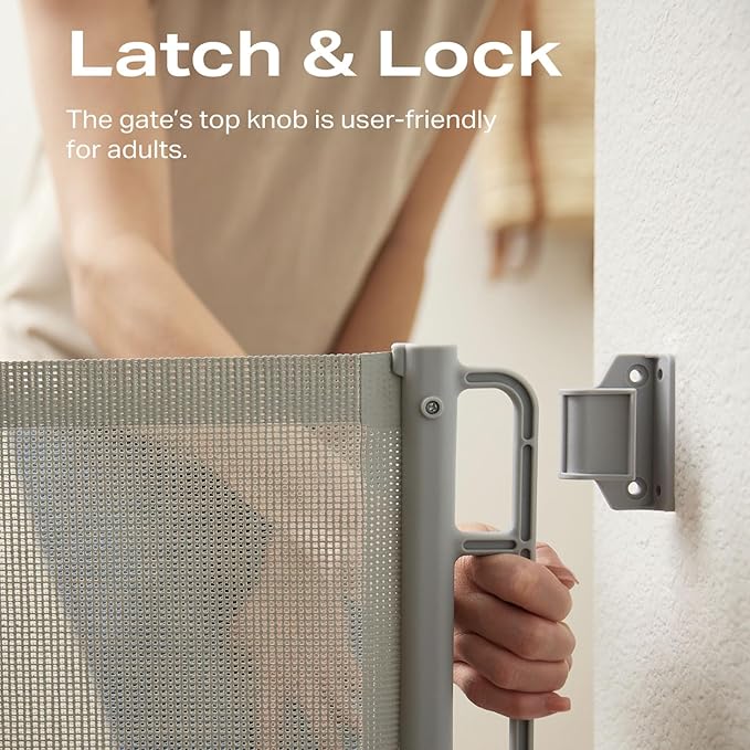 - New Safety Locking: The knob at the top of the mesh gate ensures that the retractable pet gate is easy to use for adults and can be opened and closed with one hand, while curious little ones and pets will not be able to make any naughty bids for freedom