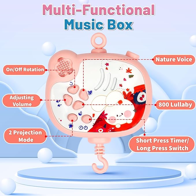 - 【Baby Crib Toys】: Baby Mobile includes a music box with adjustable volume and soft lighting that plays lullabies. With the soft music, the animal rattles slowly rotate to accompany and soothe your baby to a sweet sleep.