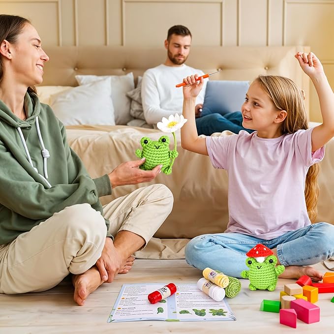 - All-In-One Crochet Starter Kit: CROCHETTA beginner crochet kit includes everything you need to start: 6 different colored yarns, ample stuffing, 1 yarn needles, 4 safety eyes, 5 stitch markers, 2 ergonomic crochet hooks, 1 pair of scissors, 1 Hot Melt Glue, 1 Flower Stem, 1 crochet daisy frog and mushroom frog pattern, and a beginner's basic crochet manual.