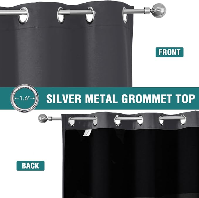 - SET DETAILS: Set of 2 total blackout curtain panels per package. Each lined curtain measures 52 inch wide by 90 inch long with 8 silver metal grommets (1.6 inch inner diameter) on top, easy to install and slide.