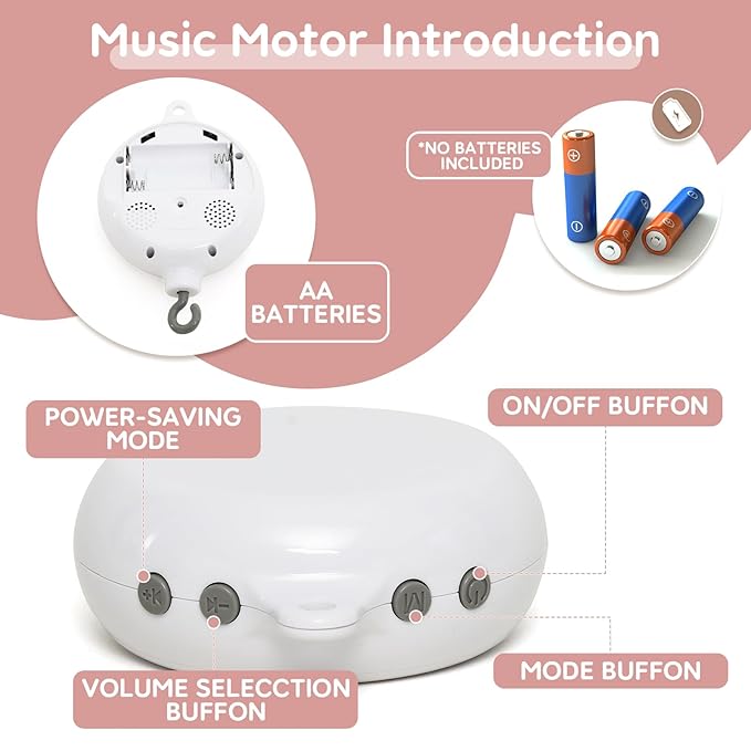 - 【35 Lullaby Music】The baby musical mobile plays 35 soothing classical melodies to help soothe your baby to sleep. The music box has 3 modes: music only, spinning only, and spinning with music. Requires 2 AA batteries (not included). (Tips: Each piece of music plays for 20-25 seconds). It creates a harmonious and relaxing atmosphere to keep your baby comfortable while sleeping. Automatically shuts off after 30 minutes to save power.