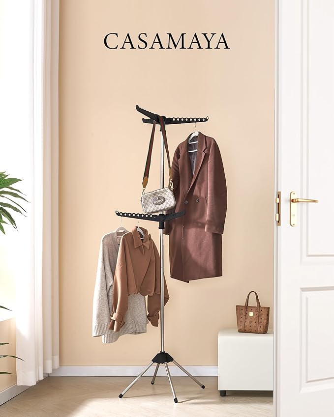 - [Large Capacity] This 2-tier drying rack can holds 54 pieces of clothing or other accessories,three hanging rods are designed with holes to fix the hangers to keep the clothes drying neatly.