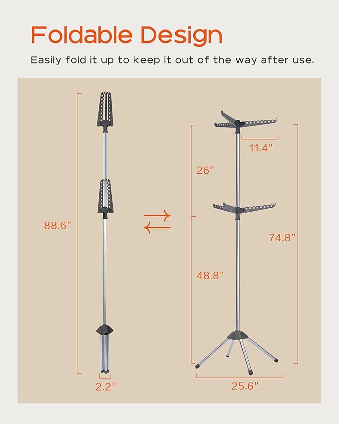 - [Foldable and Space-Saving] This vertical drying rack measures 25.6”D x 25.6”W x 74.8”H and takes up very little space. After use, simply fold the four legs and three drying rods into a smaller size: 2.2 "D x 2.2 "W x 88.6H, which can be leaned against the footrest, perfect for apartment laundry rooms or narrow spaces and corners.