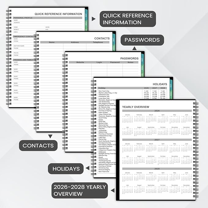 - 🍅 UNIQUE DETAILS - Calendar Planner Pages | 2 Contacts Pages | 2 Password Pages | Notes Section | 2026-2028 Yearly Overview | 2026-2028 Holidays | Notes Pages | Important Dates | Reference Calendars | Monthly Tabs | Double-sided Pockets | Premium Thick Paper | Flexible Cover | Bucket List