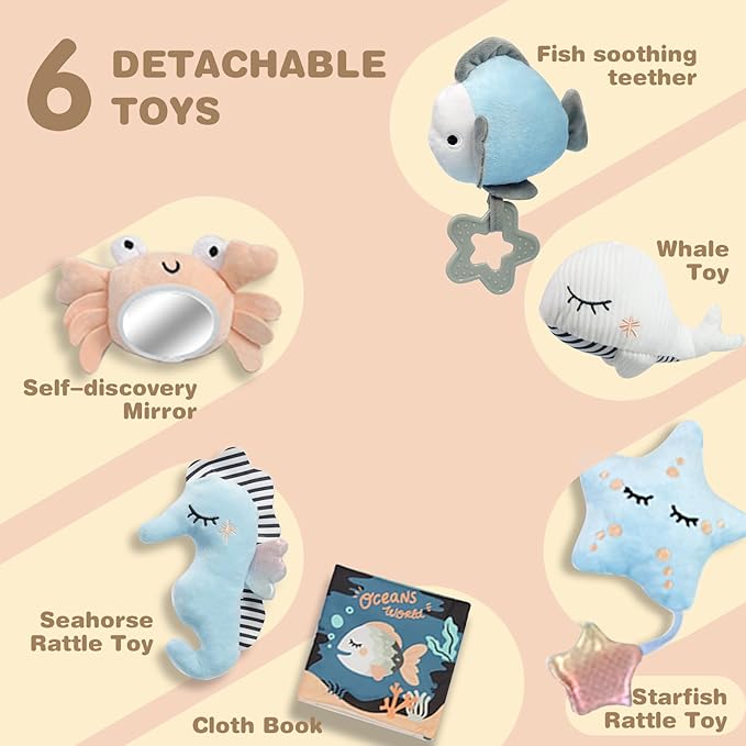 - STIMULATES SENSORY DEVELOPMENT: The 6 removable marine animal accessories of our play gyms for 0-6 months fit perfectly on a variety of baby items where toys can be hung. Includes cloud, star and seahorse toys for auditory awareness training; crab and cloth books for visual awareness training; and whale and sea fish for tactile awareness training. Each of these toys of the activity mat for babies 0-6 months can improve baby's awareness of the outside world in different ways