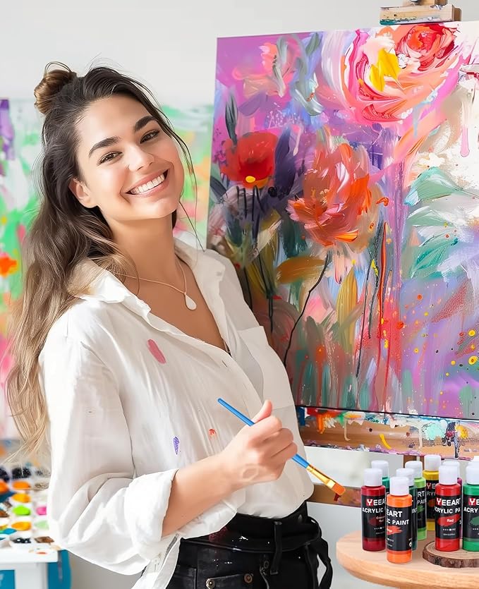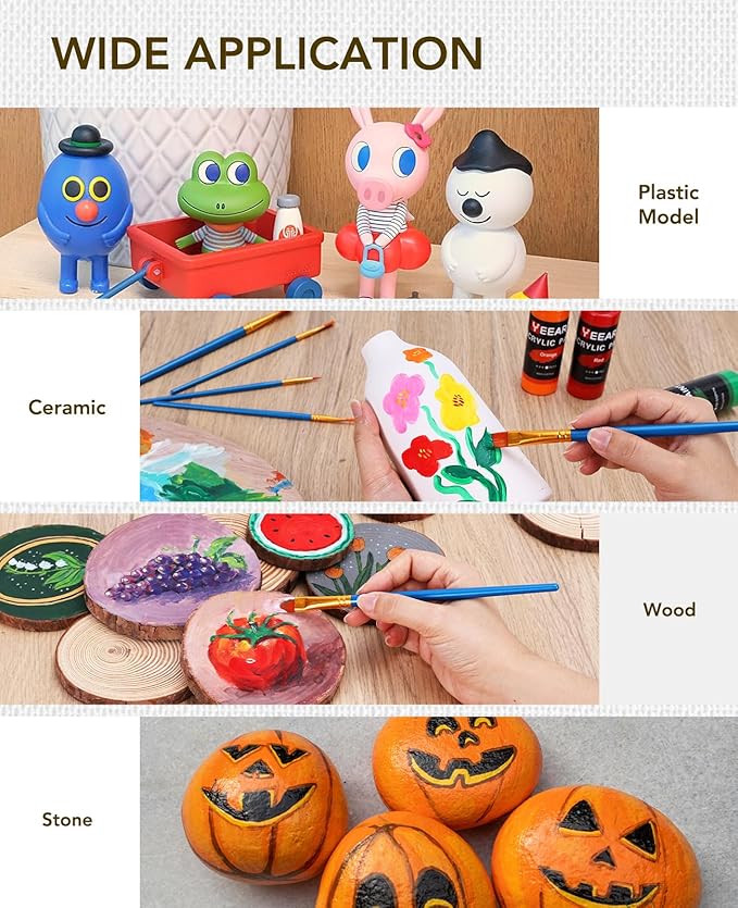 - WIDE APPLICATION : Dry fast, water-proof and fade-resistant, acrylic paint is suitable for most surfaces, so do not limit your creativity to one place, You can versatile in canvas, stone, wall, wood, glass, paper, cloth, scrap booking, ceramic, decorative wallpaper and so on. Just let your imagination run free and add an artistic touch to your life. Acrylic paint set are perfect for professional artists, kids, students, beginner and art lovers for painting and crafting.
