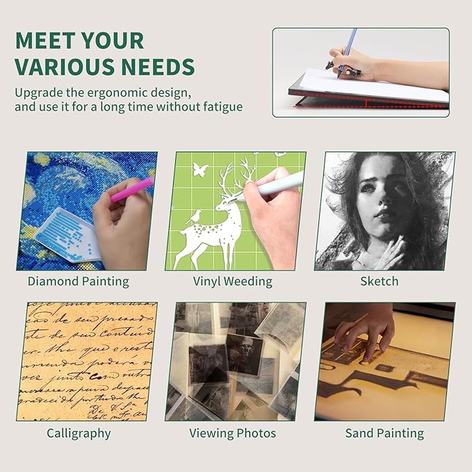 - <𝗕𝗮𝘁𝘁𝗲𝗿𝘆 𝗣𝗼𝘄𝗲𝗿𝗲𝗱 𝗗𝗲𝘀𝗶𝗴𝗻>: The cordless light drawing pad boasts a rechargeable battery, delivering up to 4 hours of uninterrupted usage with just a single 2.5-hour charge. This functionality elevates the light pad's mobility, empowering users to engage in work or creativity even in settings devoid of power sources. Its portability renders it perfect for outdoor sketching or scenarios where power outlets are scarce. The absence of cords translates to reduced clutter and heightened convenience in your workspace.