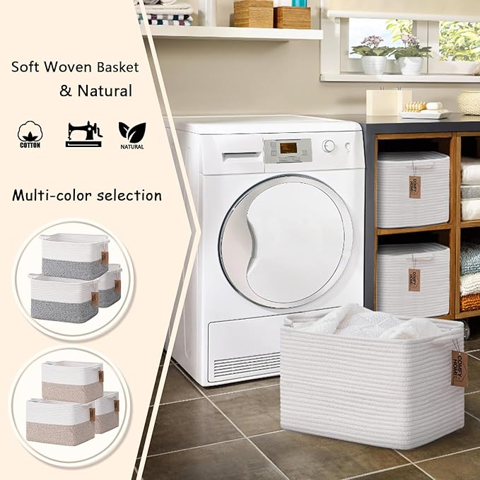 - MEDIUM BASKETS FOR ORGANIZING: 13.5''Lx11''Wx 9.5''H, Cotton rope baskets can be used in baby room, kid’s room, nursery, living room, bathroom, office. And are very ideal for storing books, toys, clothes,towels. It's a great way to store them out of sight