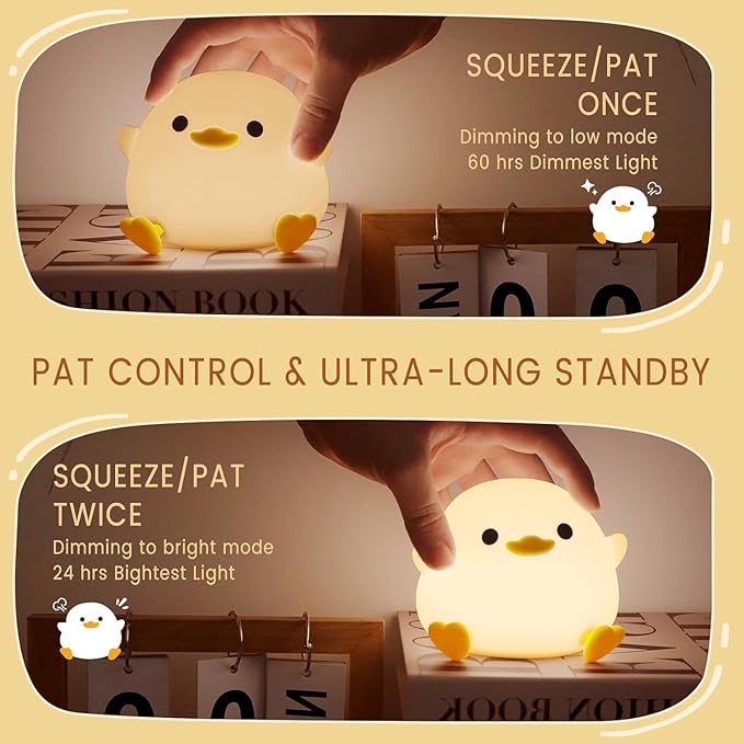 - 𝐃𝐢𝐦𝐦𝐚𝐛𝐥𝐞 𝐃𝐮𝐜𝐤 𝐂𝐮𝐭𝐞 𝐋𝐚𝐦𝐩𝐬: You can touch the lovely ducky night lights with 20 minutes timer choice, no need to manually shut it off. 2 levels different brightness settings: You can tap the dodo duck body to adjust the brightness of this cute lights in the weak and normal gear. Warm and soft lighting, let you sleep easily in a warm and cozy atmosphere. You can of course also use it during the day as a cute night light lamp or a decorative light for their room