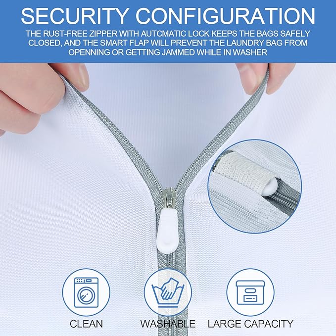 - The automatic locking zipper ensures that the zipper will not open during the washing process. Each laundry bag has an elastic zipper protector