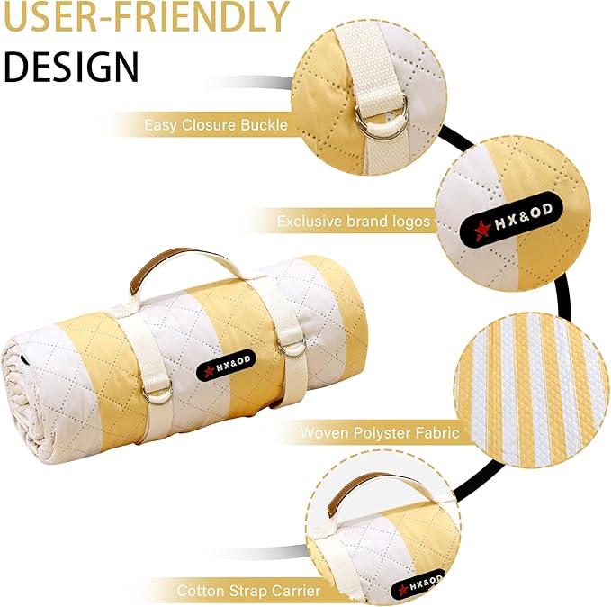 HX&OD Outdoor Picnic Blanket Extra Large, 80''*80'' Waterproof Picnic Mat with Stakes Foldable Camping Blanket Portable with Carry Strap for Beach Mat (Yellow& White, 80''*80'')