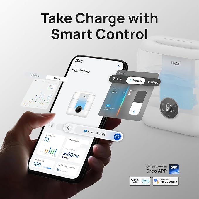 - 𝙃𝙪𝙢𝙞𝙙𝙞𝙛𝙮 𝘾𝙤𝙣𝙩𝙧𝙤𝙡, 𝙒𝙝𝙚𝙧𝙚𝙫𝙚𝙧 𝙔𝙤𝙪 𝘼𝙧𝙚: Use the DREO app, voice commands, or Alexa to remotely manage your cool mist humidifiers, Easily monitor indoor humidity and adjust settings to ensure a healthy environment for your family, especially suited for babies, plants, and pets.