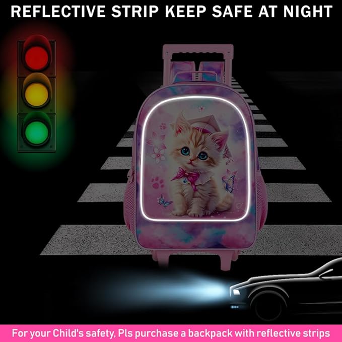 - Cat Rolling Backpack Details: Reinforced side mesh pockets and strap links, padded and breathable shoulder straps, smooth double zipps, these designs make the kids roller backpack for girls more durable.