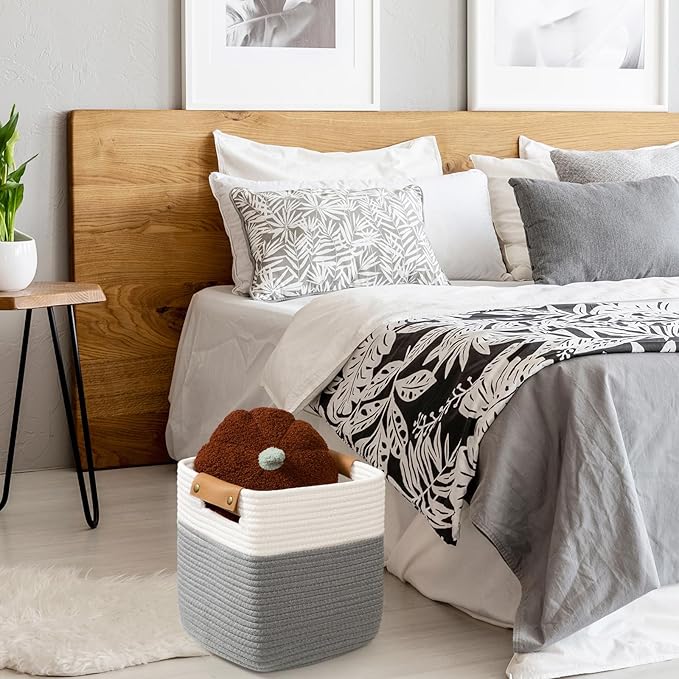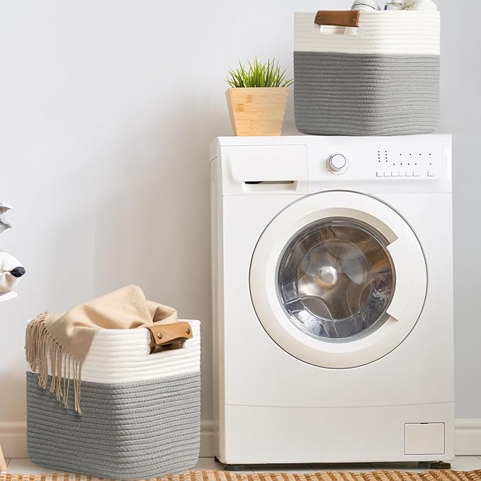 - Modern Charm: The storage baskets feature leather handles that provide comfortable grip for easy carrying. Woven storage bins are made of 100% cotton to ensure long lasting use. The contrast between the cotton and leather creates a stylish and modern look