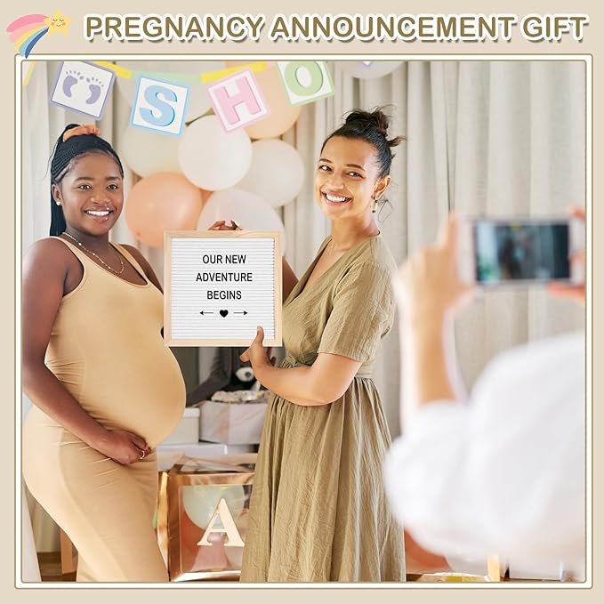 - Adorable Pregnancy Announcement Set: this set is the impressive and lovely way to announce your pregnancy; Including 1 kit of felt letter board (equipped with 340 pcs plastic letters and numbers, symbols, 1 drawstring pouch), 1 short sleeve baby bodysuit, 1 white photo frame, 1 bear plush, 1 pair of baby booties, and 4 baby wood blocks; Acting as a beautiful keepsake to memorize the lovely moment