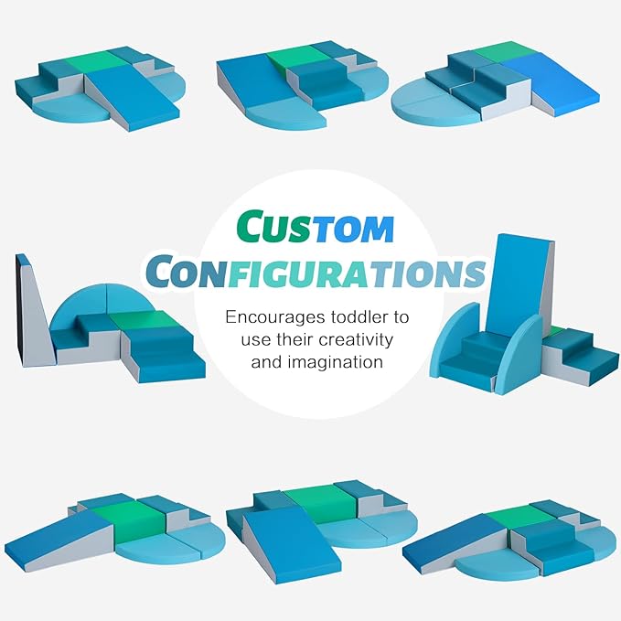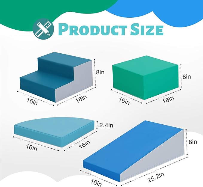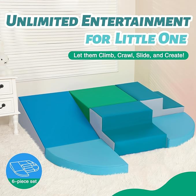 - 6-Piece Set: Baby climbing blocks consists of 2 dark green stairs, 2 sky blue half-moon, 1 green square and 1 navy slide. This soft play equipment stimulates your child's imagination to create endless combinations of structures, allowing them to enjoy the fun of the toy as they climb up and down, stacking and swapping four different shapes