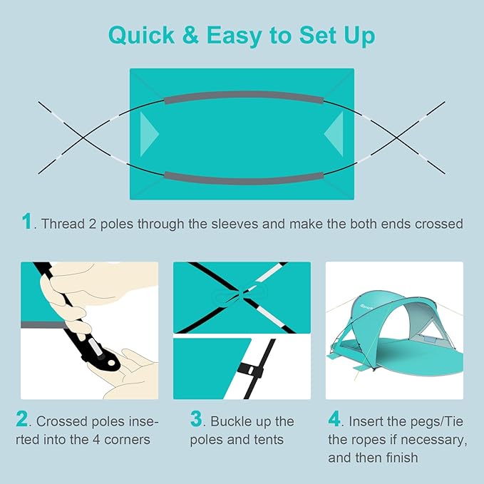 - Stable and Durable Construction: Equipped with sturdy 8mm thickened poles, 4 sandbags (2 on each side), 8 stakes (including 4 ground stakes and 4 plastic stakes), and 4 wind ropes, the tent can withstand 3-4 level wind forces to remain stable and secure, ensuring reliable windproof performance for your beach adventures