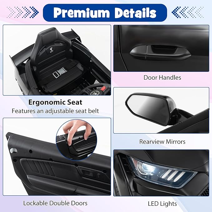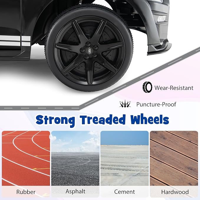 - Realistic Licensed Ford Car: Delight in the excitement of the ride on car, featuring 2.4 MPH high speed, 1.1 MPH low speed, one-button start, and soft start and stop for a smooth ride. This kids car also boasts 2 strong motors for young explorers to take adventures.