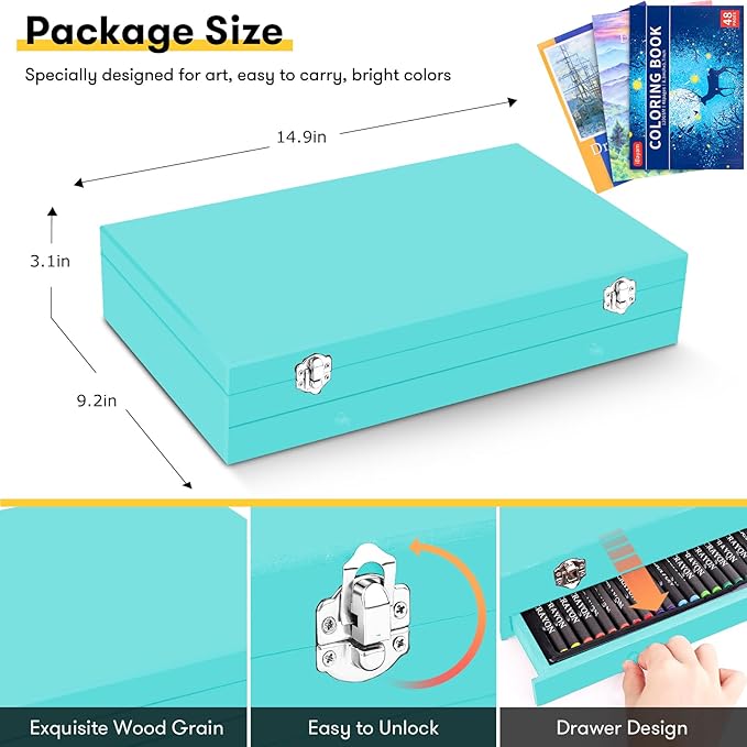 - 🎨【High Quality, Deluxe Art Kit】The Deluxe art case has everything you need to get started creating in a compact wooden case! You can begin drawing, coloring and painting as soon as you open the box. Specially designed with 2 big sketchbooks, 1 coloring book, 1 Gift Box. Great art set for any level of artist. This art case makes a great Gift for adults and kids, girls and boys, they are going to have so much fun!