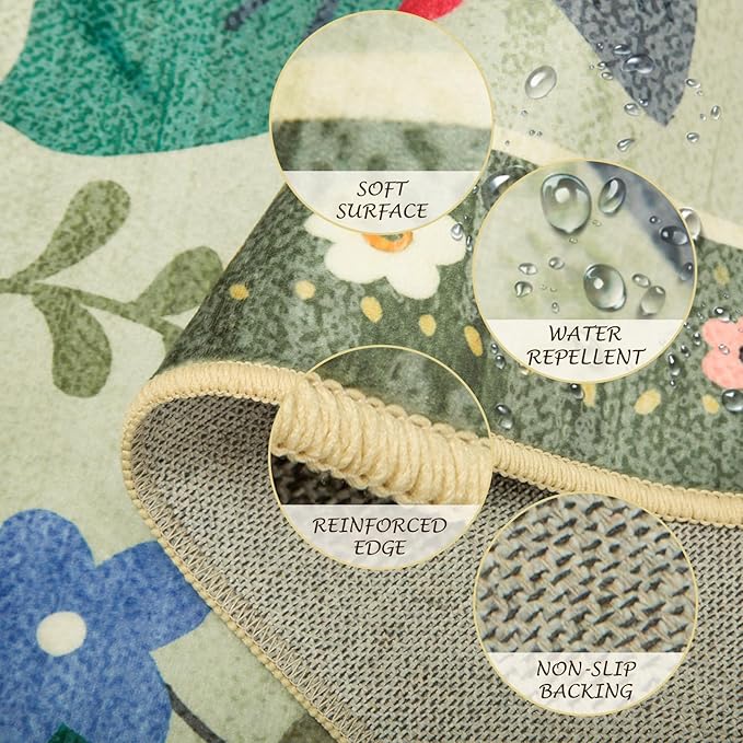 Floral 3x5 Area Rug Machine Washable Soft Print Boho Carpet Non Slip Doormat Low Pile Flower Area Rugs for Living Room Bedroom Nursery Kitchen Dining Room Indoor-Light Green