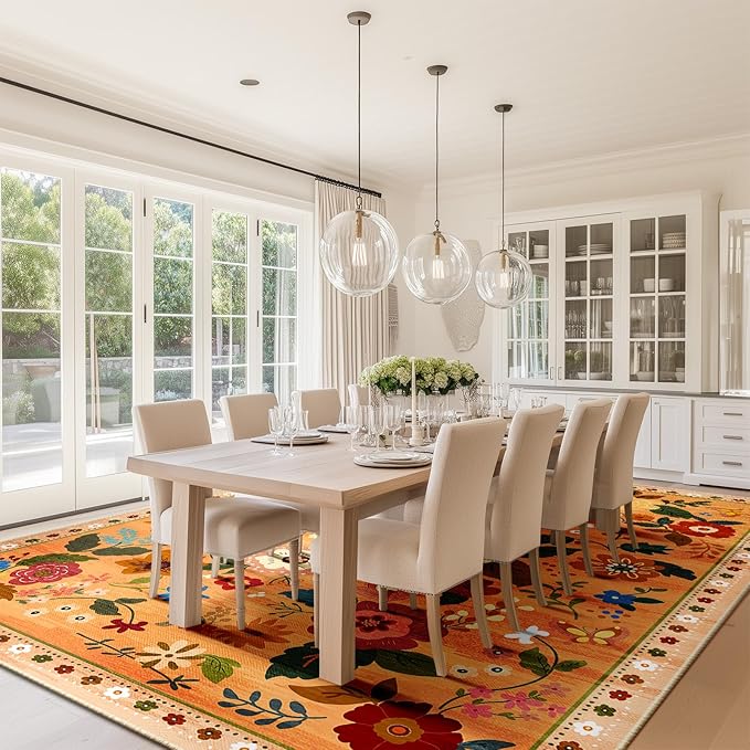 Floral 5x7 Area Rug Machine Washable Soft Print Boho Carpet Non Slip Doormat Low Pile Flower Area Rugs for Living Room Bedroom Nursery Kitchen Dining Room Indoor-Yellow/Orange
