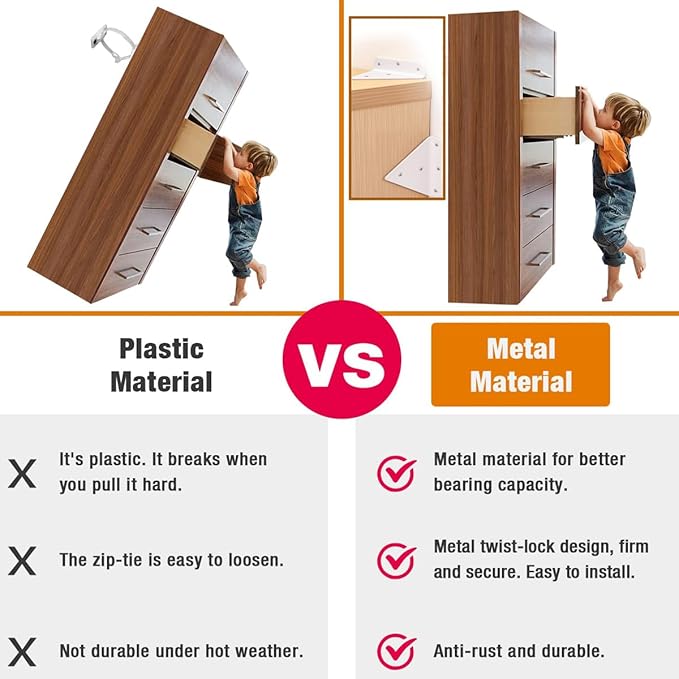 - High Quality Material: These anti tip furniture anchors for baby proofing are crafted from high-quality material, offering superior corrosion resistance and lasting protection against rust. Fire and heat resistant, they are sturdier and more durable than plastic straps, providing the perfect safeguard for your baby.