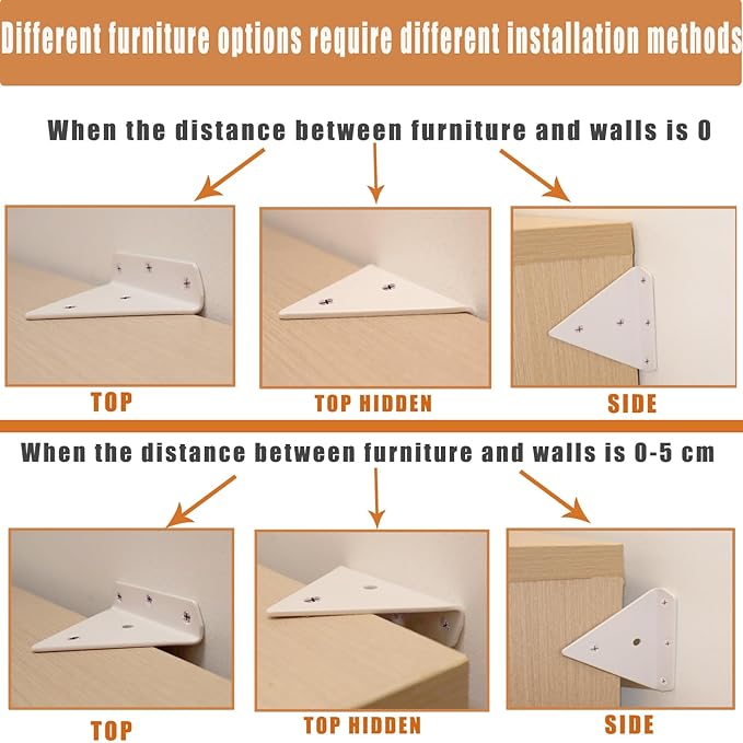 - Multiple Installation Methods: Baby proofing furniture anchor You can choose the installation method based on the distance between the furniture and the wall, or choose top or side installation or hidden installation according to the aesthetic level