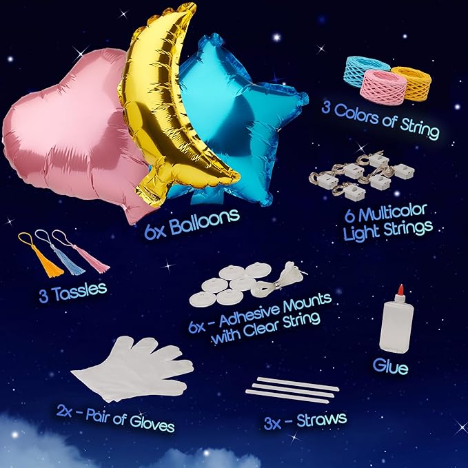 - All-Inclusive DIY Craft Set – Includes 6 balloon shapes (2 each: heart, moon, star), 3 vibrant string colors, 3 tassel colors, 6 mini LED lights, glue, gloves & mounting accessories. Everything your child needs to build glowing 3D art!