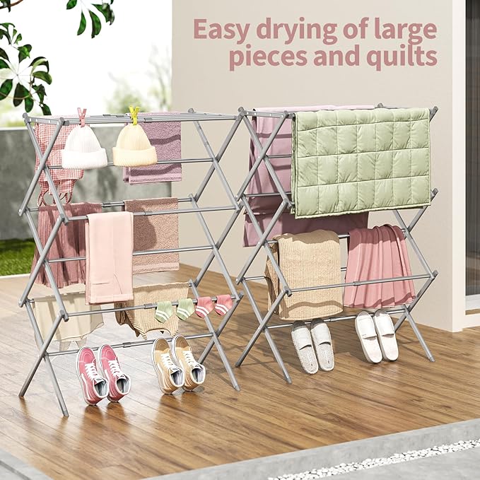 - Utility Usage: This folding laundry hanging rack provides an eco-friendly and gentler way to dry shirts, jeans, dress slacks, sweaters, and more, helping to save energy and extend the life of your clothing.