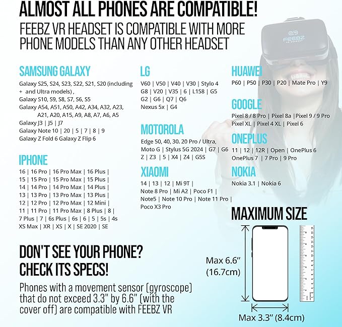 - Compatibility - Feebz VR headset for iPhone & Android model 2.0 fits more phone models than any other VR model.
