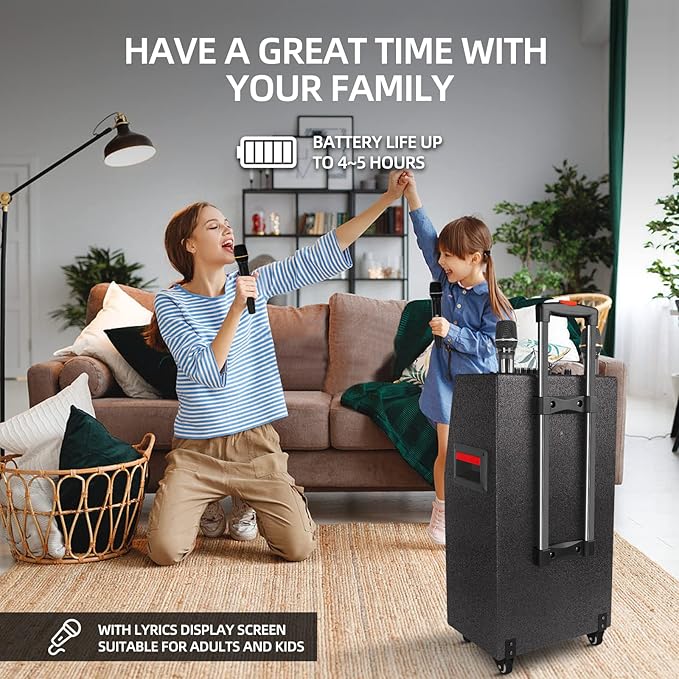 - Portable and Convenient: It adopts durable swivel wheels and pull rod design, easy to carry. Everything is organized for a travel. A 12-hour rechargeable battery in this karaoke machine with screen means you can bop your battlecry anywhere