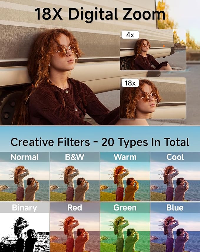 - 【18x Digital Zoom & 20 Creative Filters】The digital camera for travel offers an enhanced 18x digital zoom, allowing you to capture distant subjects clearly and in great detail. With 20 diverse filters, including vintage, Y2K, and old school styles. This digital camera is truly the first camera for begginers, ideal for those who like retro styles and y2k aesthetics.
