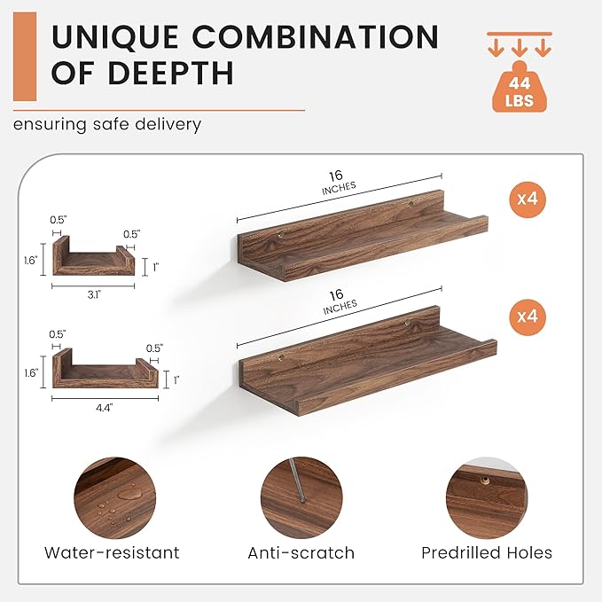 • 【Picture Ledge Perfect for Display】FLYJOE picture ledge shelves for wall turn your walls into a stunning photo gallery! These spacious shelves are ideal for showcasing a variety of picture frames in one secure place. With a thoughtful protective lip, you can display everything from photos to collectibles without worrying about them falling off